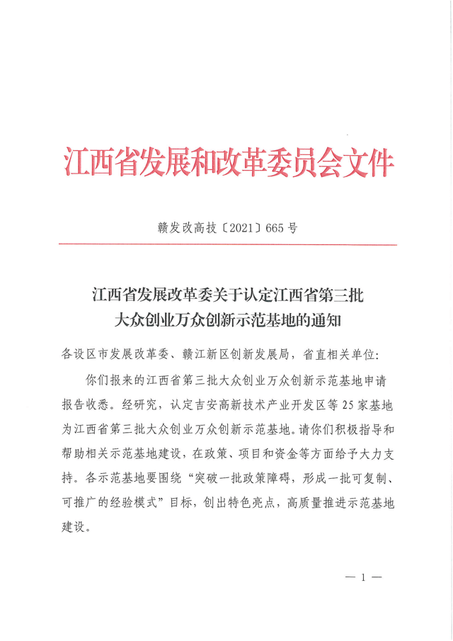 近日,省發(fā)改委印發(fā)《江西省發(fā)展改革委關(guān)于認定江西省第三批大眾創(chuàng)業(yè)萬眾創(chuàng)新示范基地的通知》(贛發(fā)改高技〔2021〕665號),我公司認定為江西省第三批大眾創(chuàng)業(yè)萬眾創(chuàng)新示范基地。